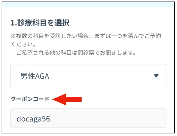 自動でクーポンコード「docaga56」が入力されるので、そのまま予約すると薬代が56%OFFになります。